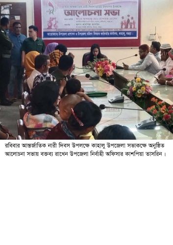 আন্তর্জাতিক নারী দিবস উপলক্ষে রবিবার (০৮ মার্চ) সকাল ১০টায় কাহালু উপজেলা সভাকক্ষে উপজেলা প্রশাসনের আয়োজনে আলোচনা সভা অনুষ্ঠিত হয়।আলোচনা সভায় সভাপতিত্ব করেন কাহালু উপজেলা নির্বাহী অফিসার কাসপিয়া তাসরিন।